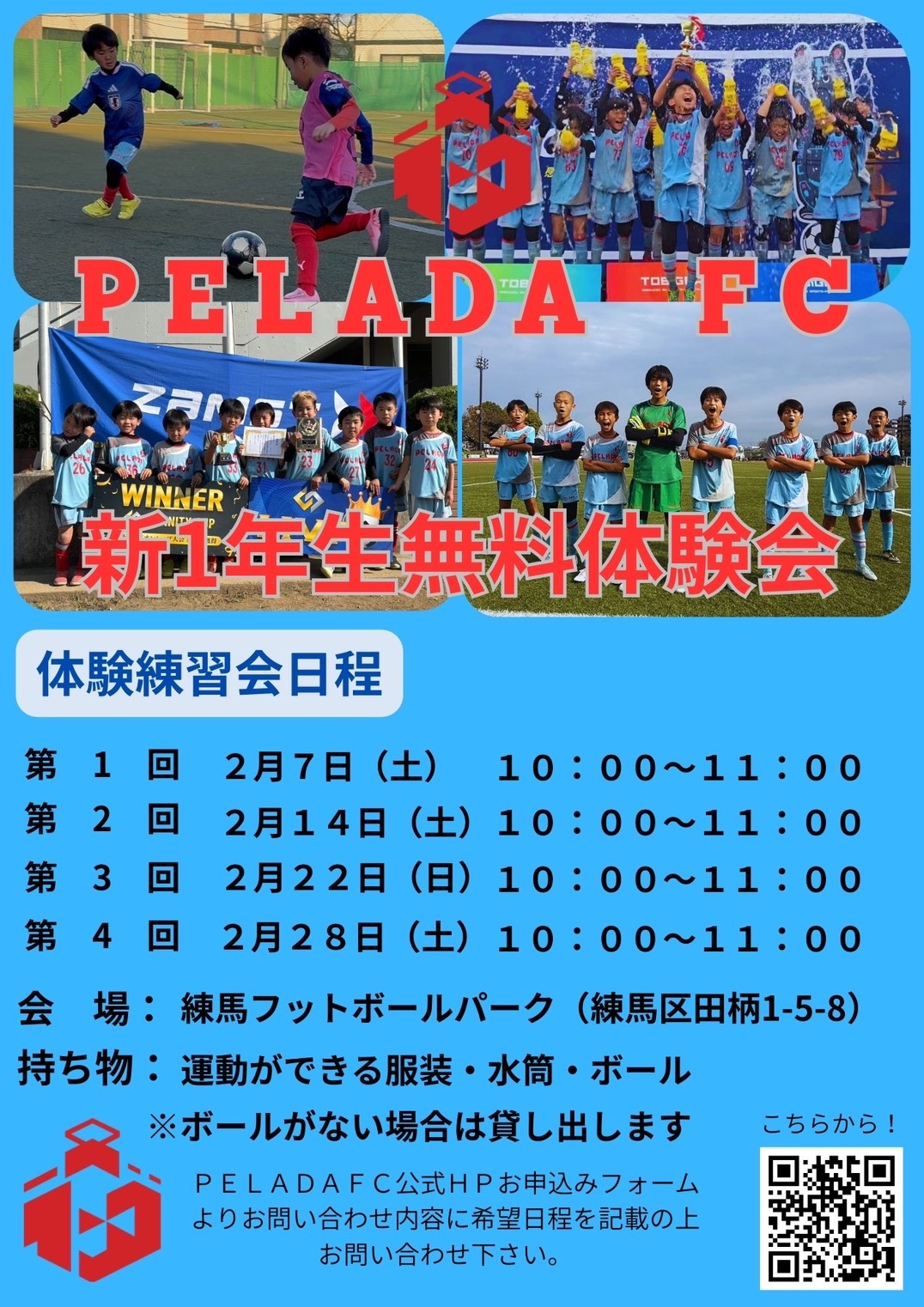 この度、PELADA FCでは2026年度新1年生に向けた無料体験会を複数回に渡り実施したいと思います!